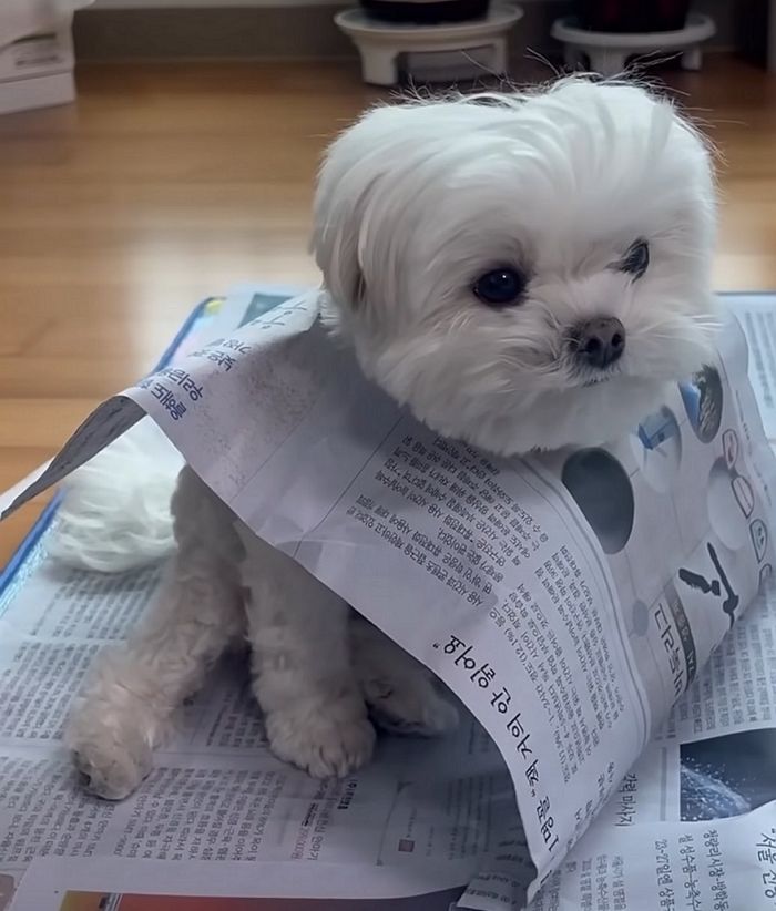 "전 부치는데 댕댕이한테 기름 튈까봐 신문지로 '앞치마' 만들어줬어요"